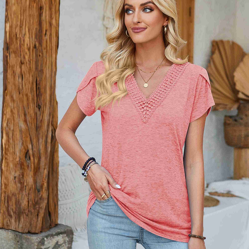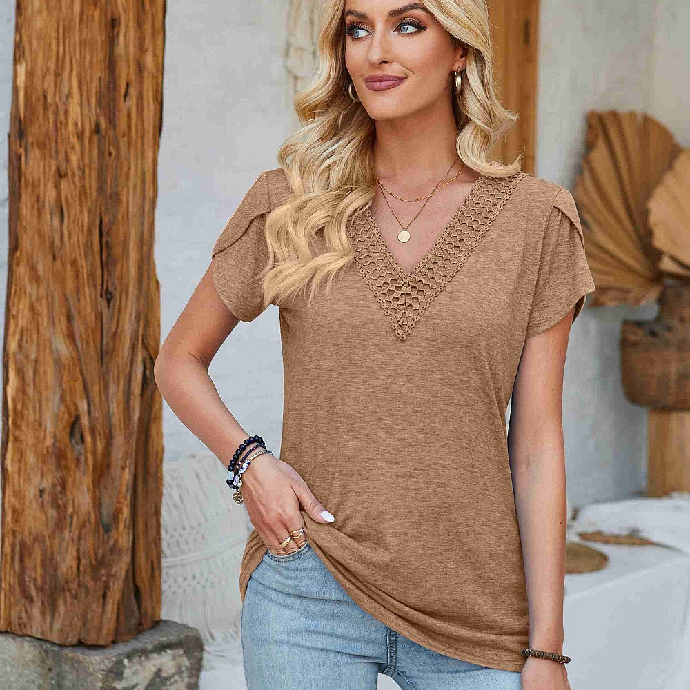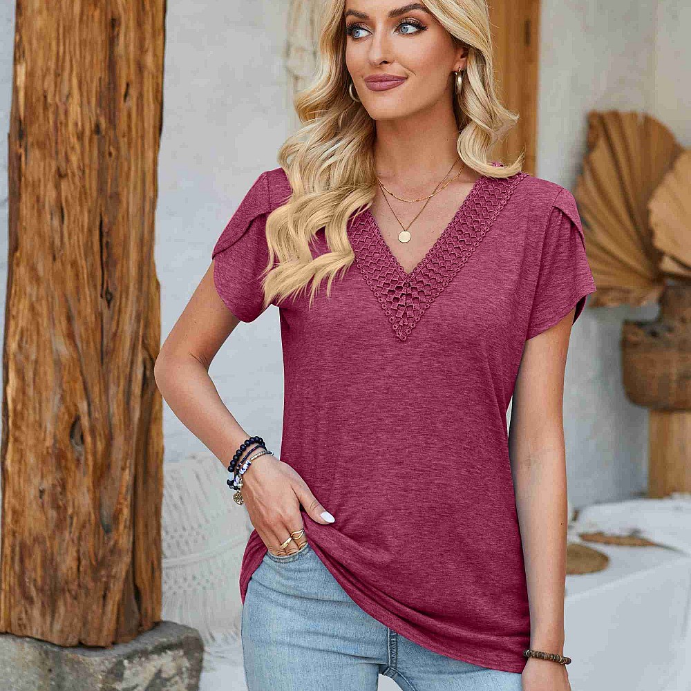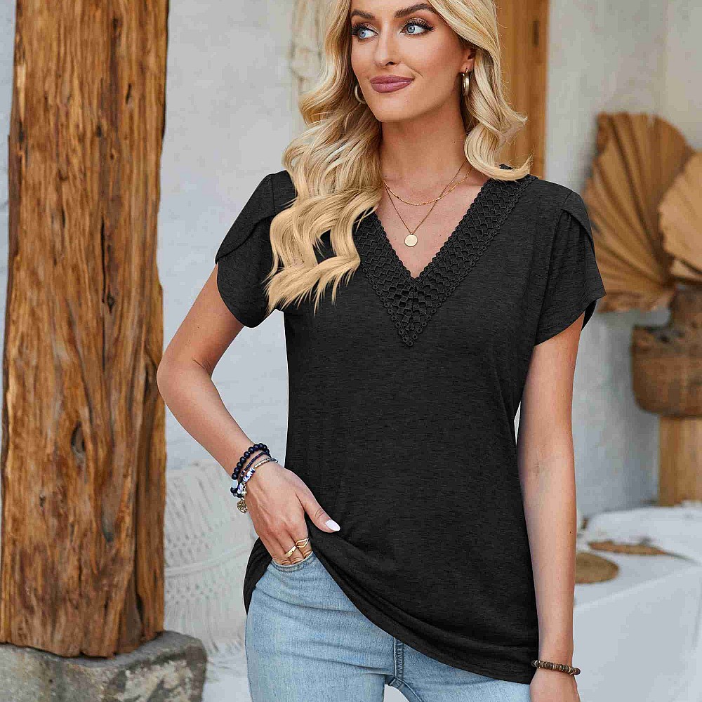 Crochet Accent V Neck Top with Tulip Detail Sleeves