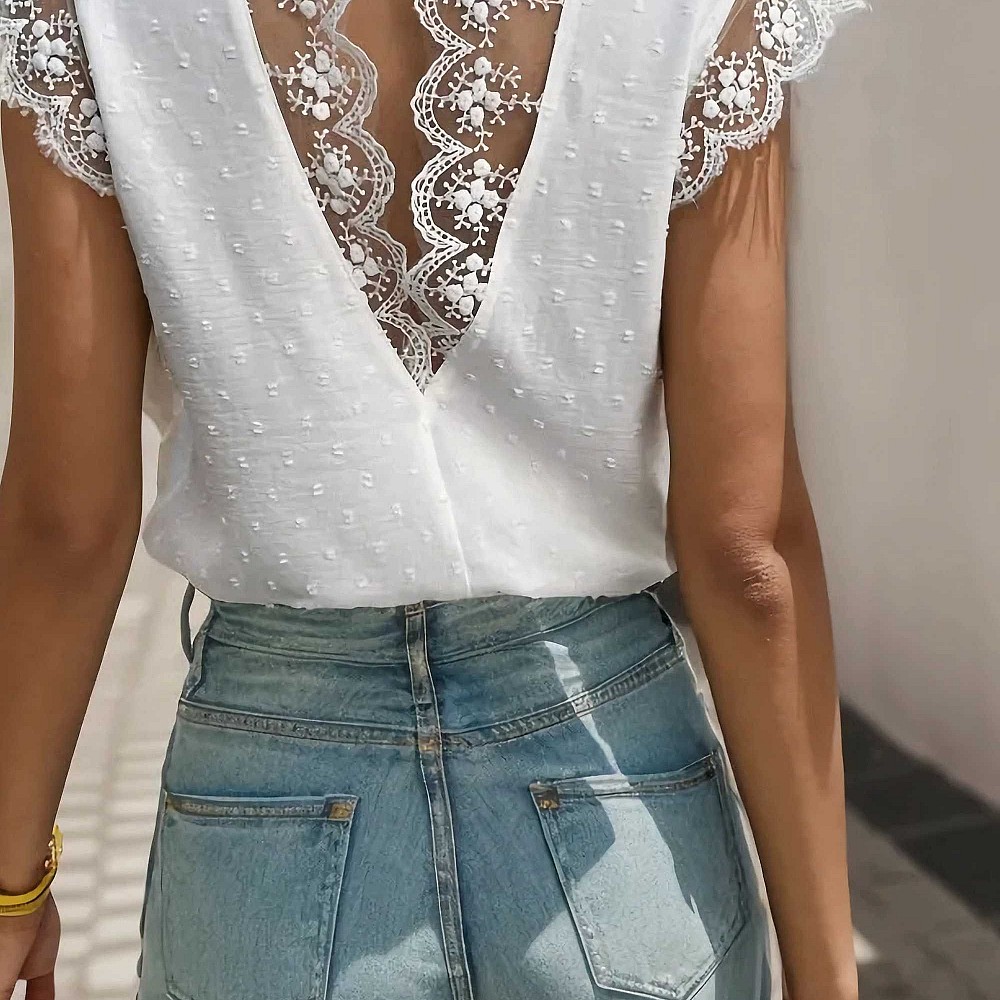 Swiss Dot V Neck Lace Cap Sleeve Shirt