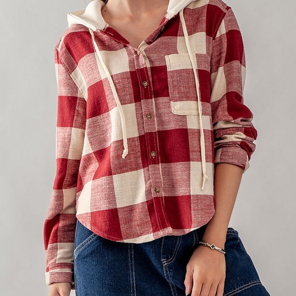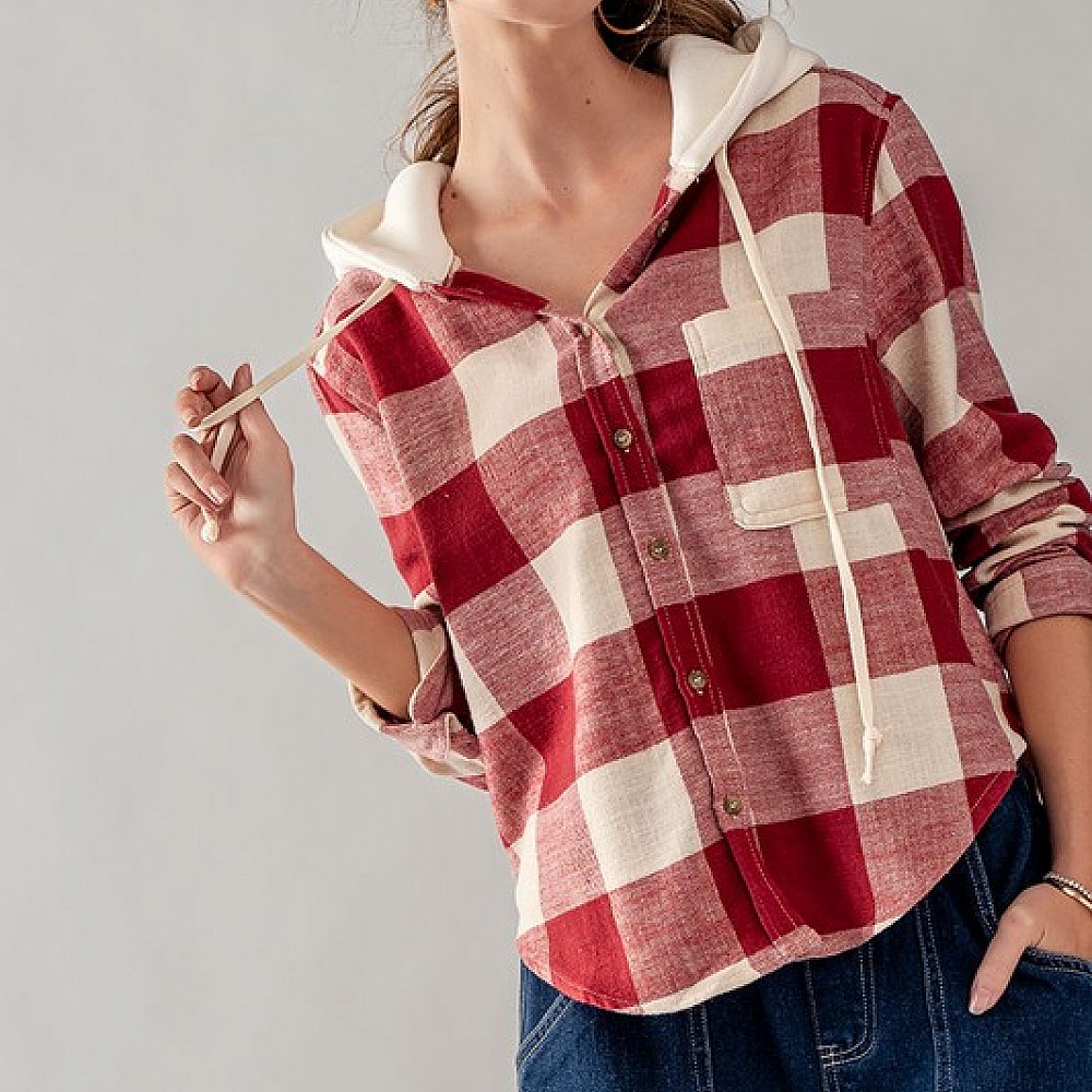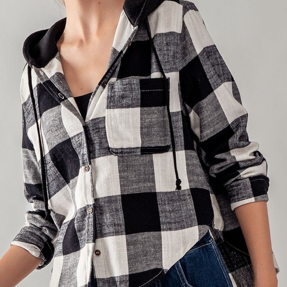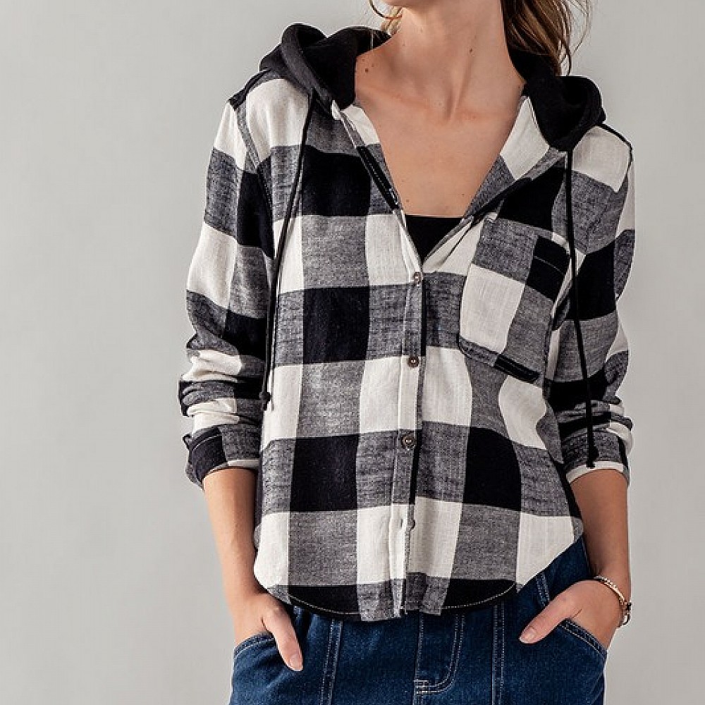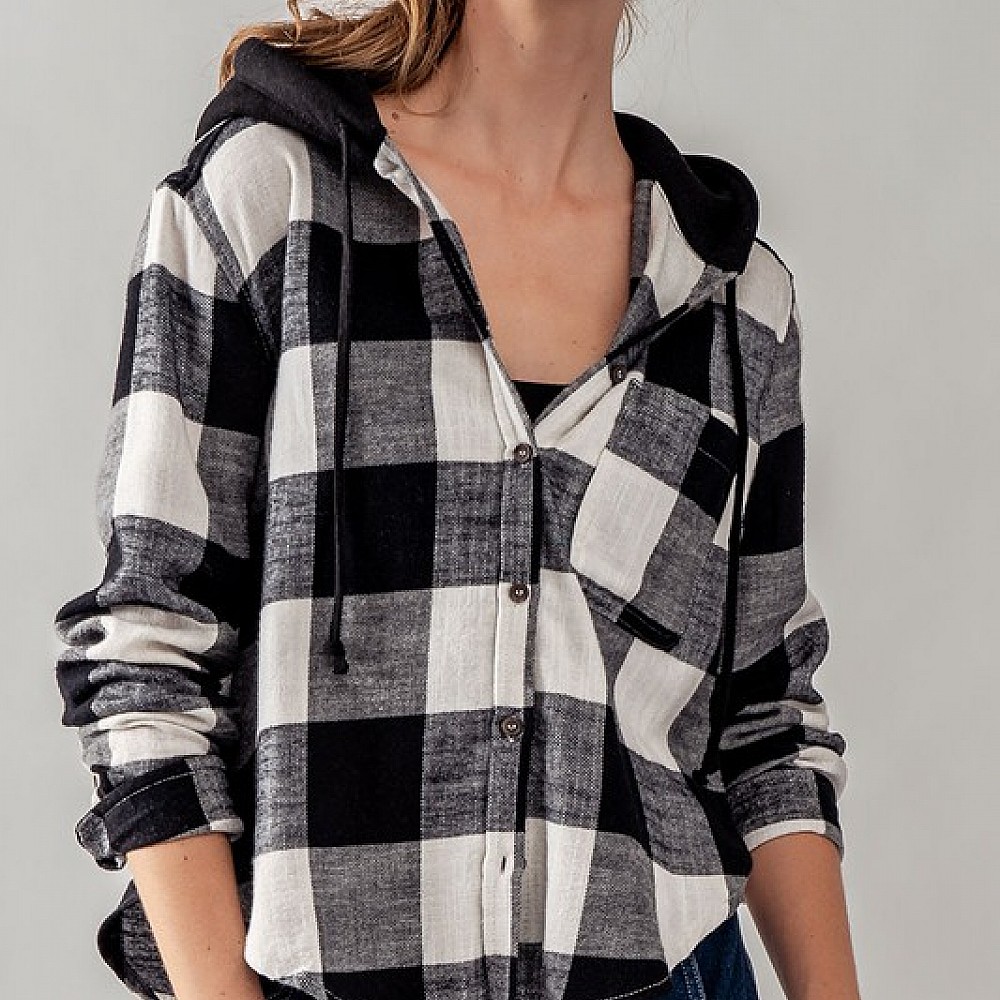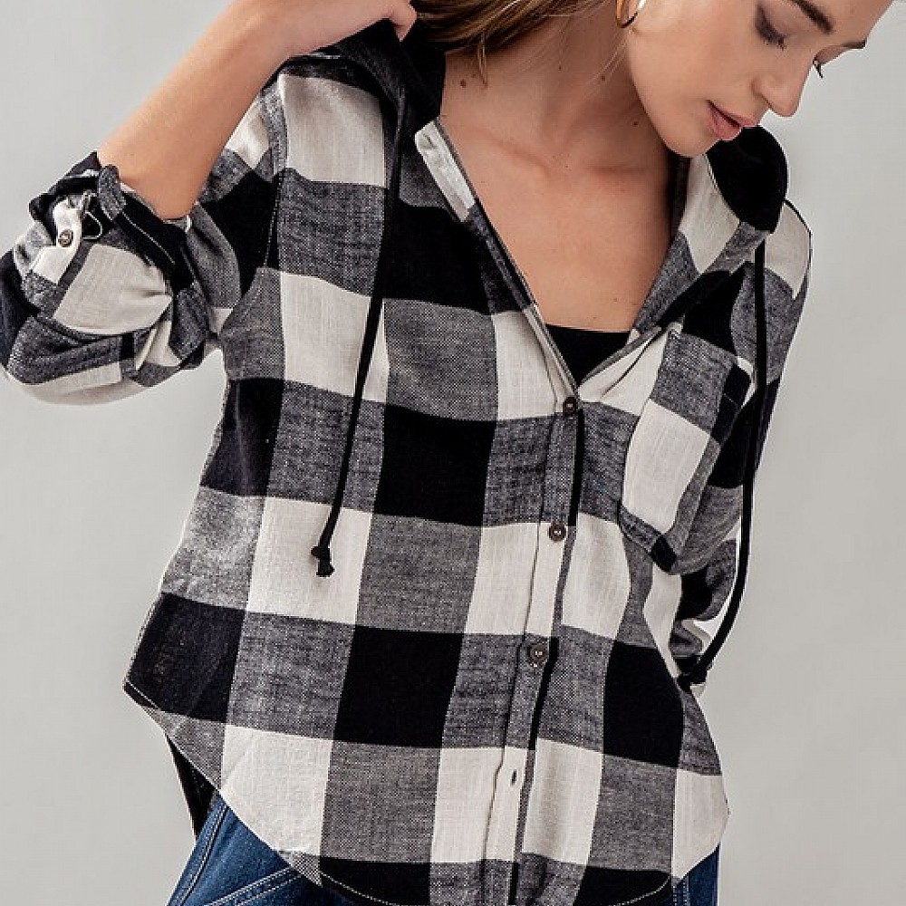Buffalo Plaid Button Down Hooded Top