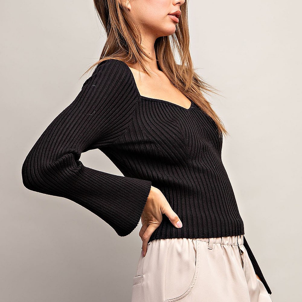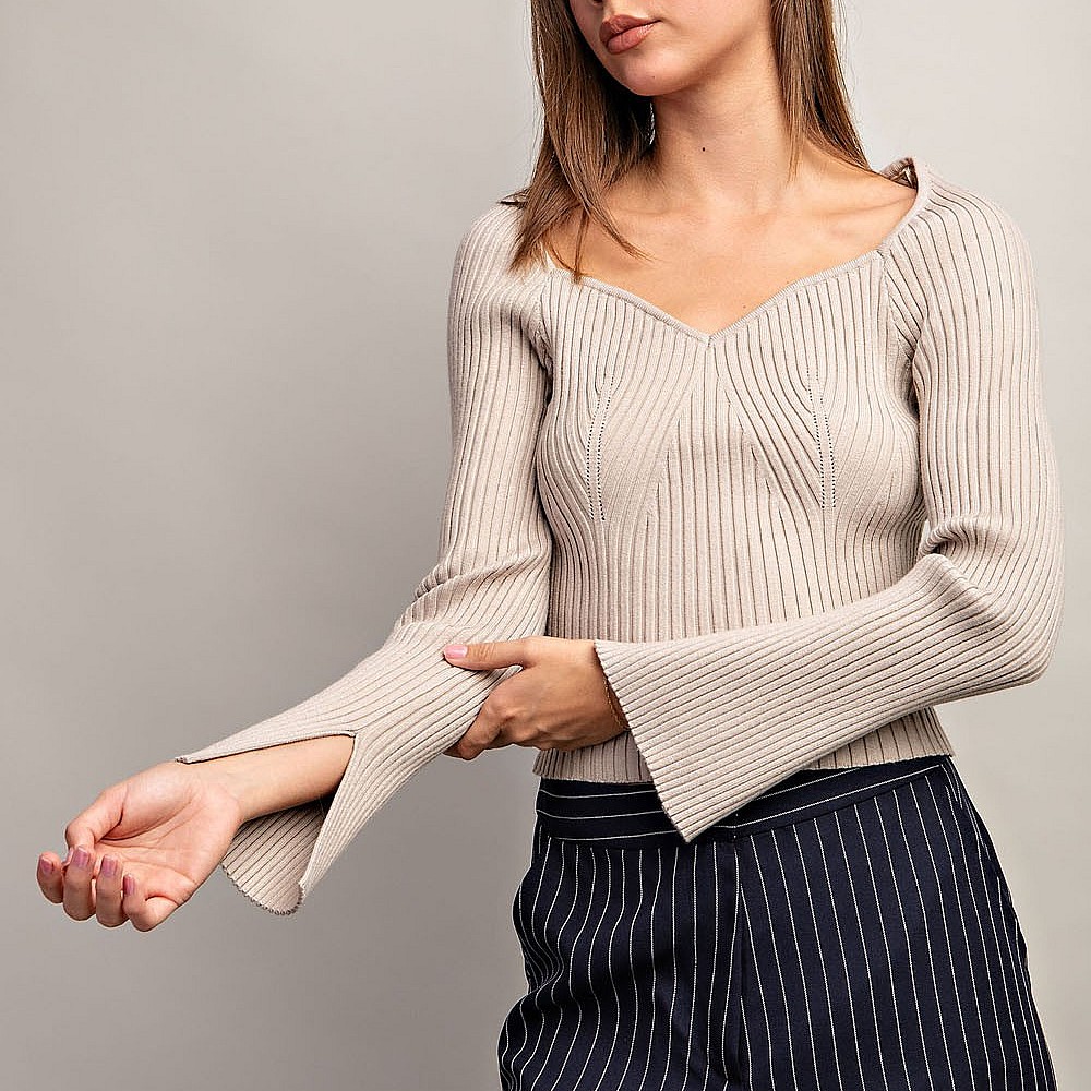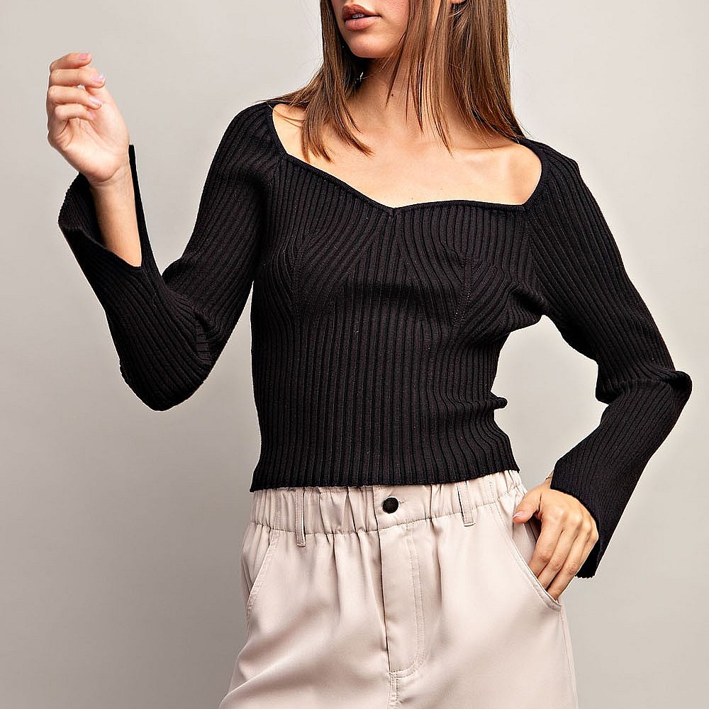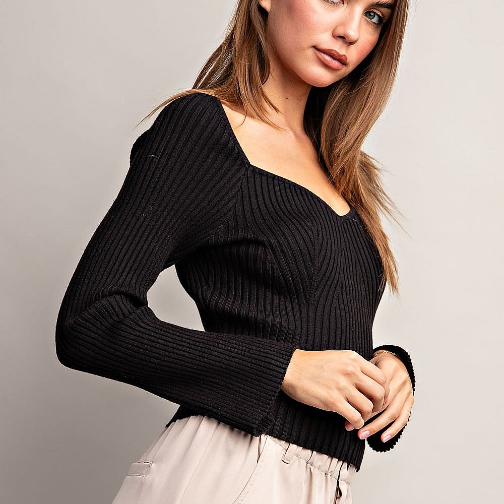 Solid long sleeve top that is ribbed throughout featuring a sweethearrt neckline, slits at sleeve cu..