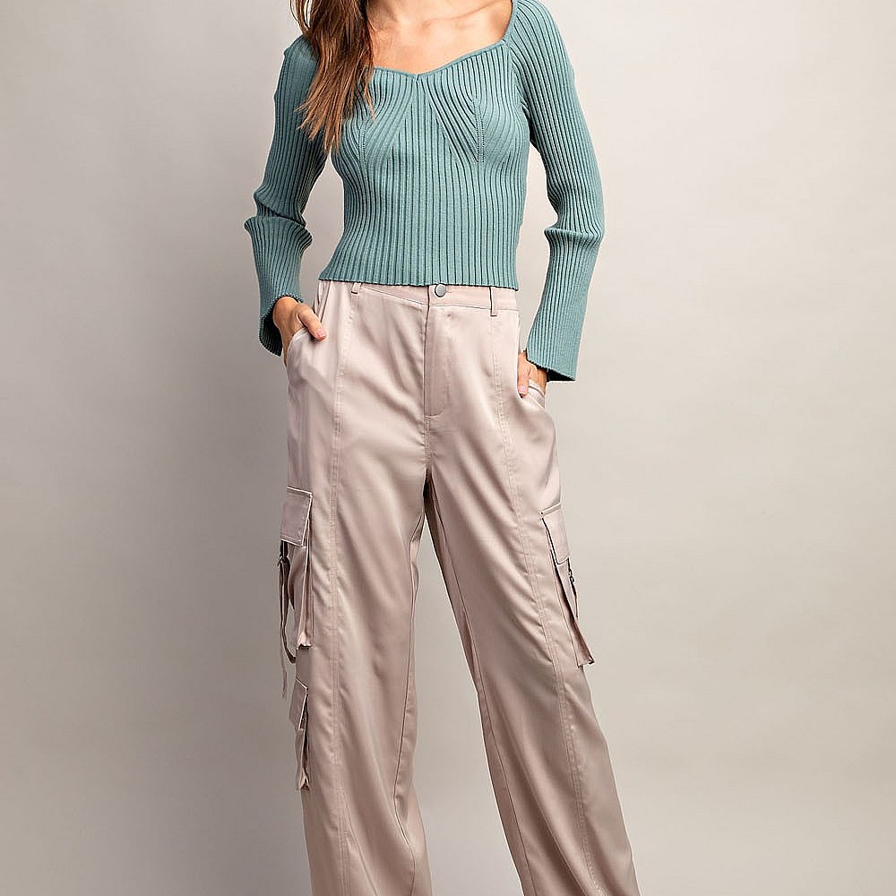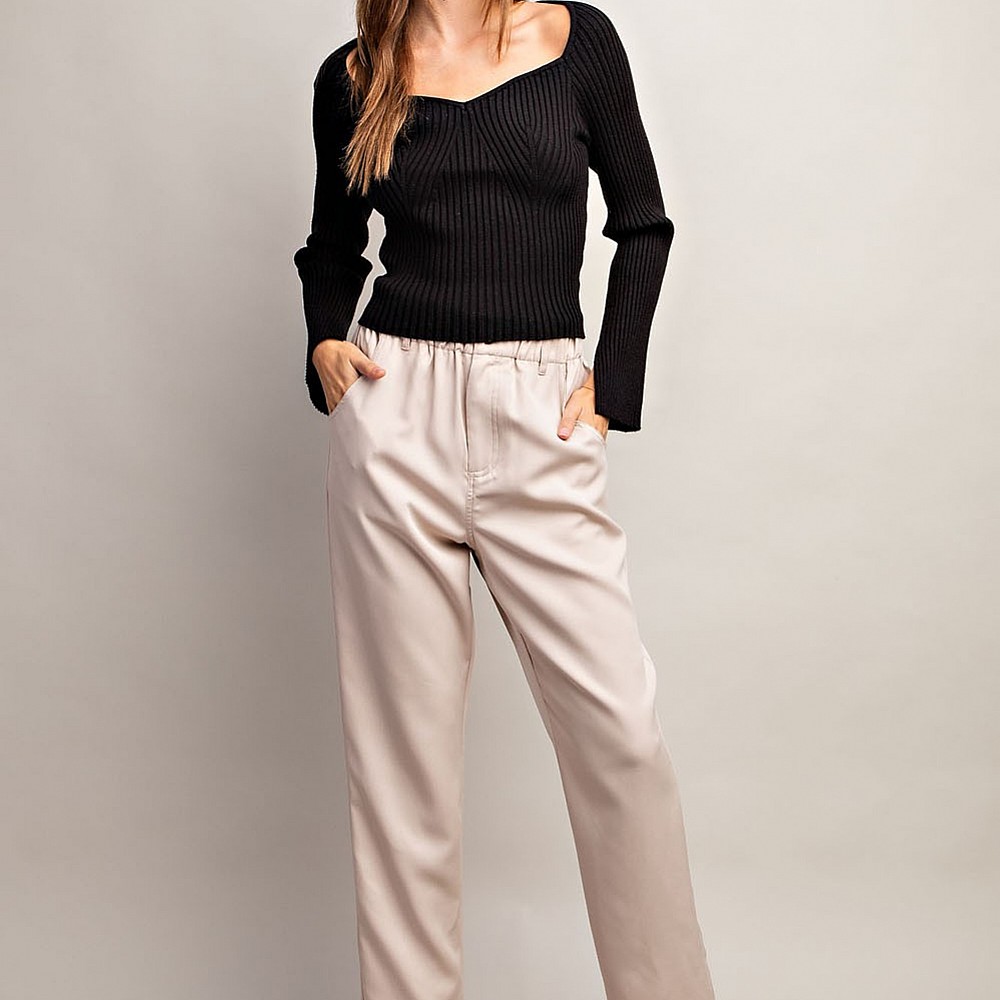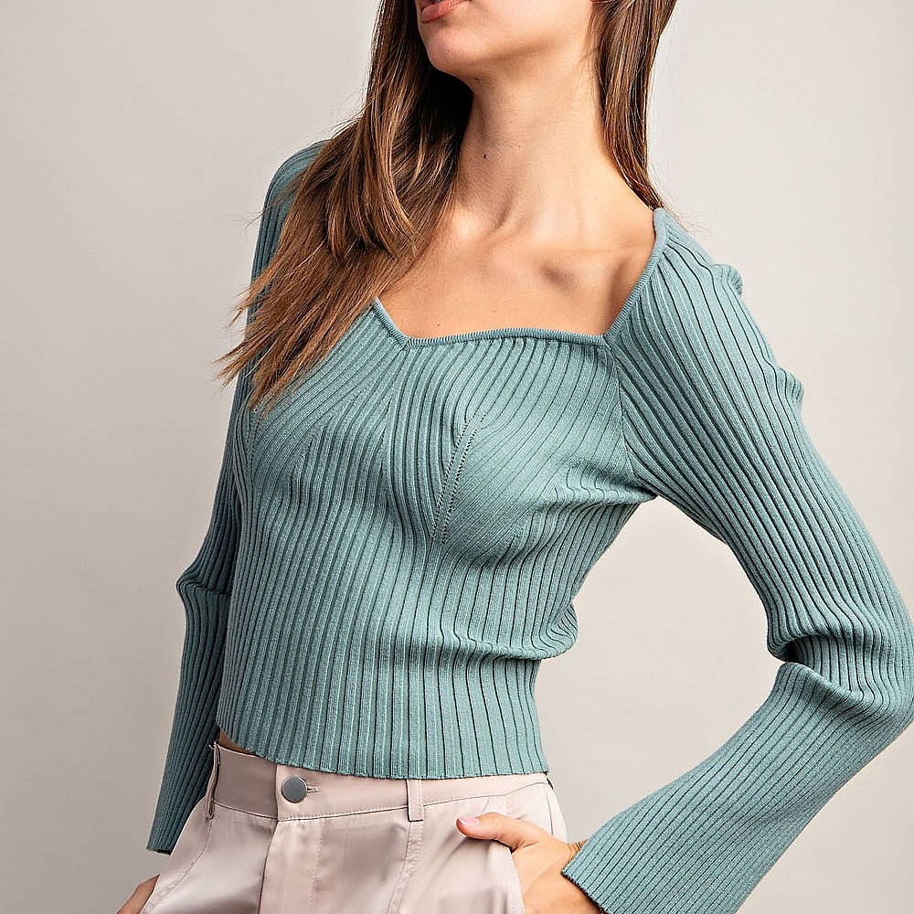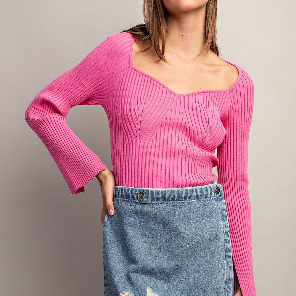 Solid long sleeve top that is ribbed throughout featuring a sweethearrt neckline, slits at sleeve cu..