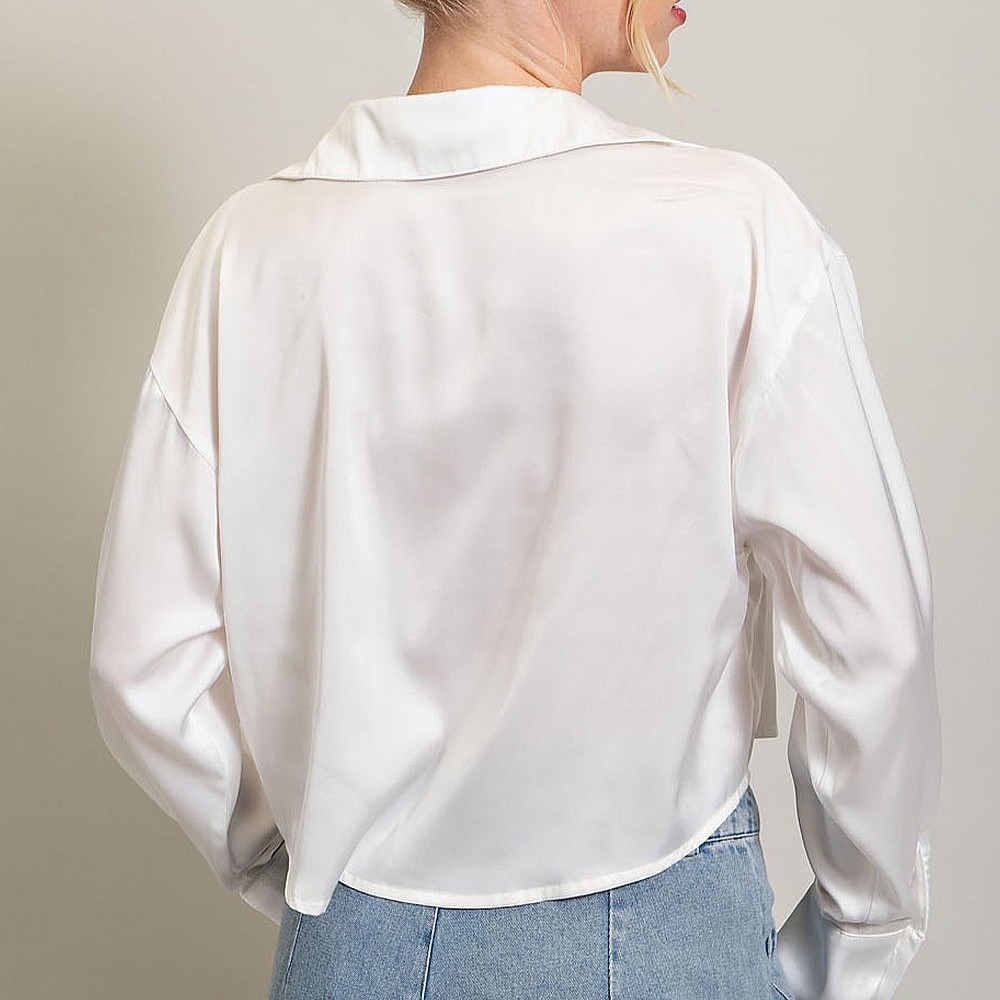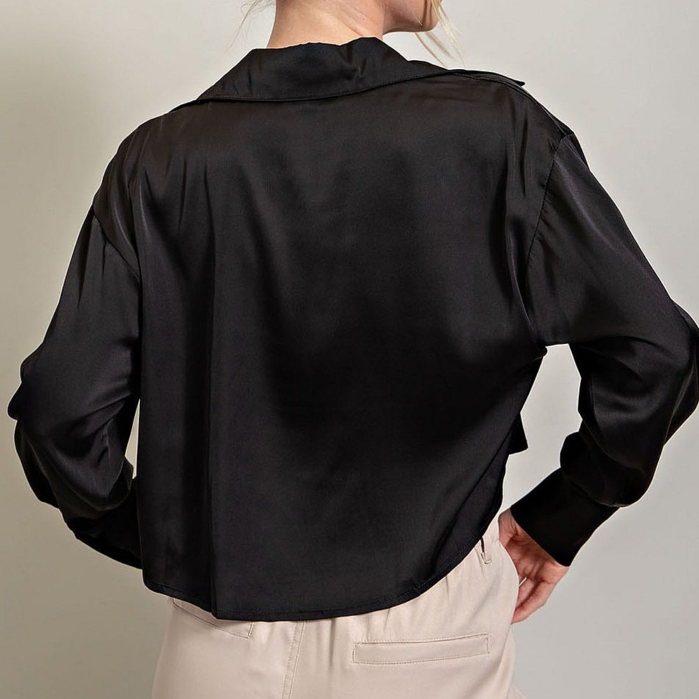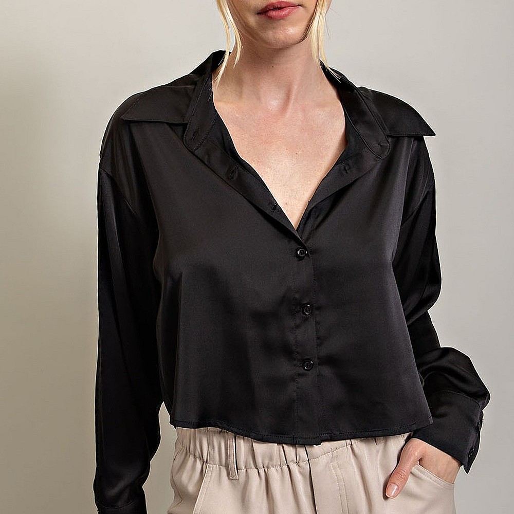 Long Sleeve Satin Top featuring a button down front, a cropped length and a collared neckline. Perf..