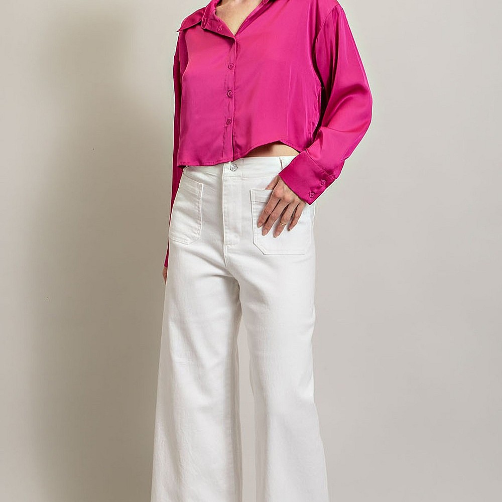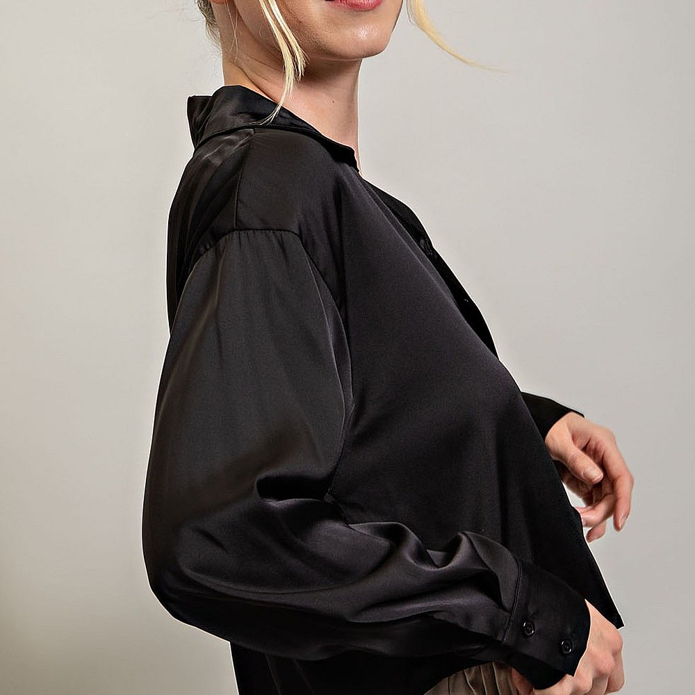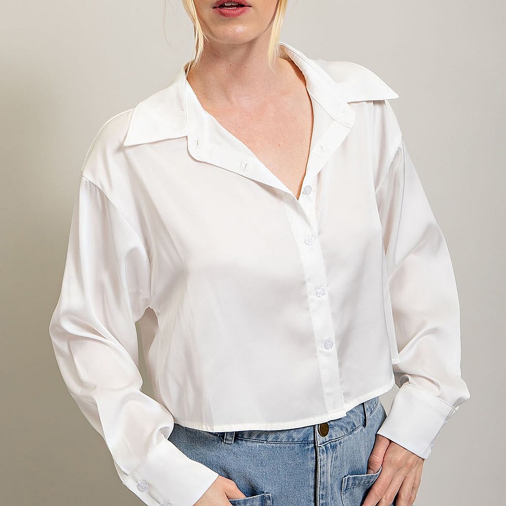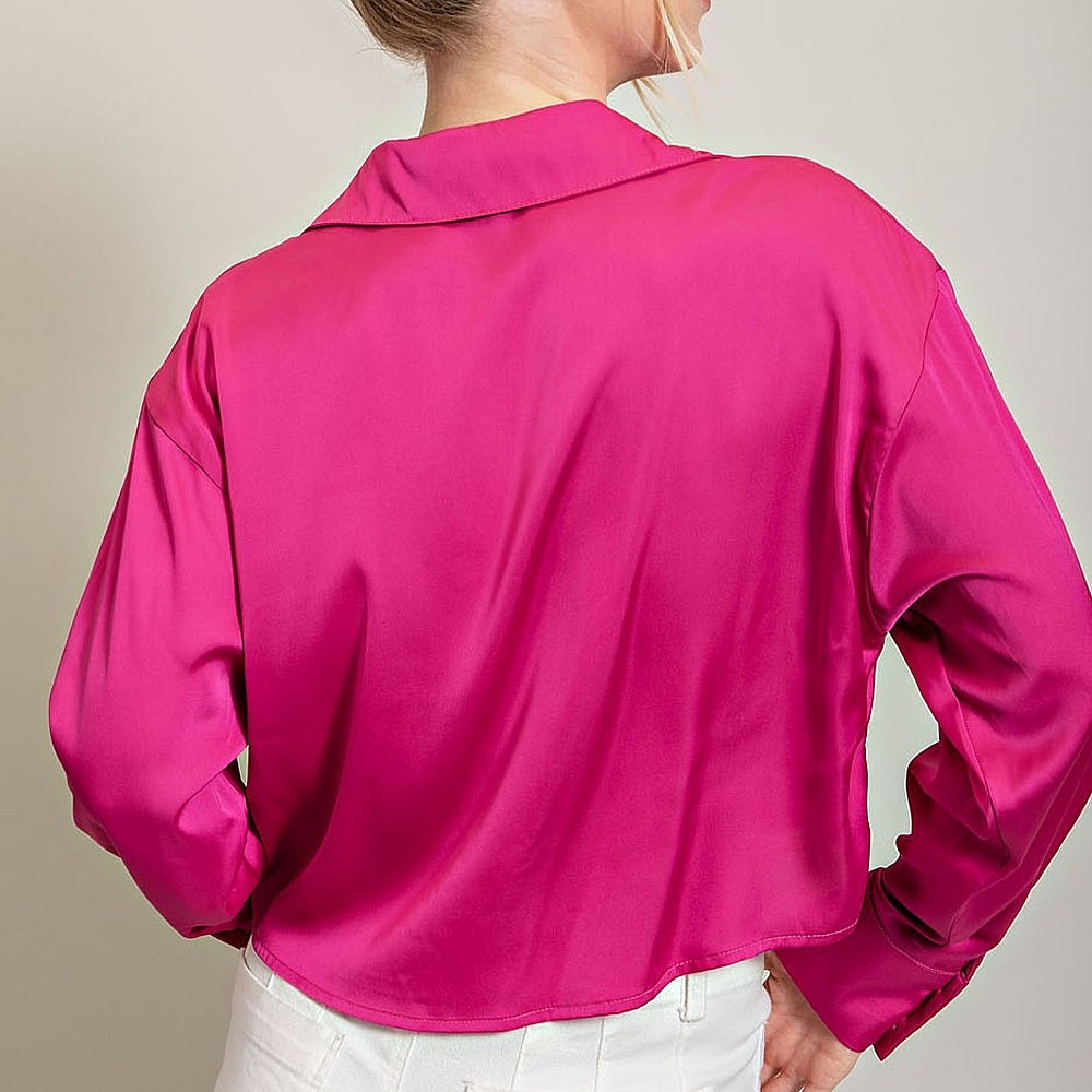 Long Sleeve Satin Top featuring a button down front, a cropped length and a collared neckline. Perf..